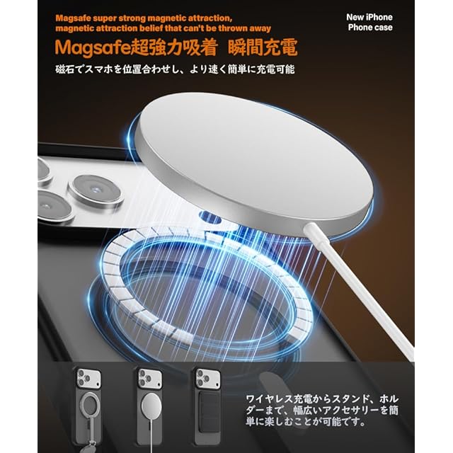 【MagSafe対応・強力な磁力吸着】ケース背面にマグネットを内蔵しているので、MagSafe充電器等にしっかり吸着、マグネットによる正確な位置合わせで、ワイヤレス充電がこれまでよりもすばやく簡単に完了します。また、すべての MagSafeアクセサリ(ウォレット、リングホルダー、パワー バンクなど、車用マウント)ワイヤレス充電対応と完全に互換性があります。