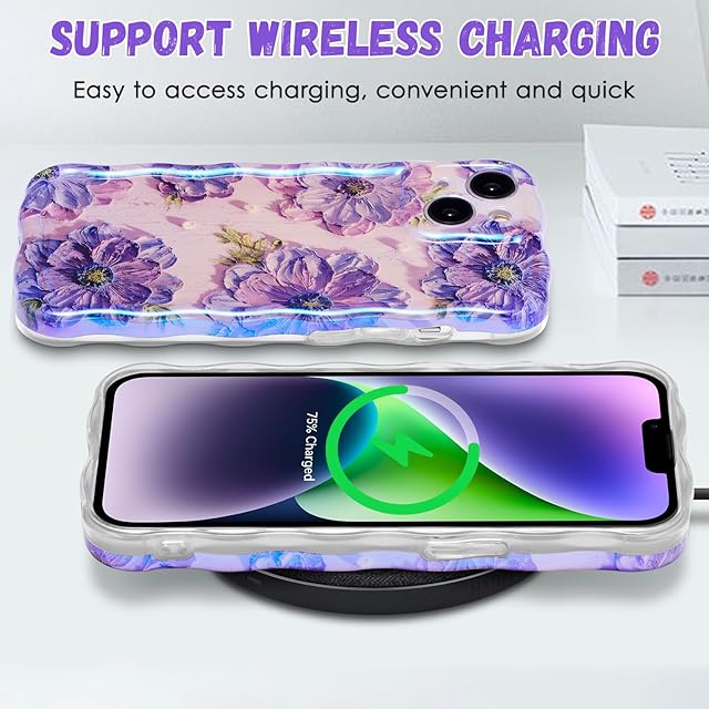 QLTYPRI iPhone 15 Plusケース iPhone 14 Plusケース TPUカバー おしゃれ 韓国 可愛い 花柄 薄型 軽量 耐衝撃 スマホケース ワイヤレス充電対応 ストラップホール付き アイフォン15 Plus/14 Plus ケース 6.7インチ 対応 - パープル