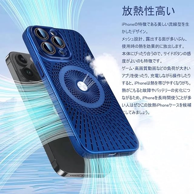 【放熱性高い】iPhoneの特徴である美しい流線型を生かしたデザイン。メッシュ設計、露出する面が多いぶん、使用時の熱を効果的に放出します。本体にぴったり合うので、サイドボタンの感度がよいのも特徴です。ゲーム・高画質動画などの負荷が大きいアプリを使ったり、充電しながら操作したりすると、iPhoneは熱を帯びやすくなりがち。熱がこもると故障やバッテリーの劣化につながるため、iPhoneを長時間使うことが多い人はぜひこの放熱iPhoneケースを候補にしてみましょう。