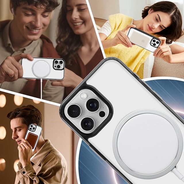 【耐衝撃・指紋防止】iPhone 15 Pro 用 ケース 半透明 Magsafe対応 マグネット搭載 アイフォン 15 Pro ケース マット仕上げ ストラップホール付き 薄型 滑り止め 黄変防止 耐久性 カバー ワイヤレス充電対応 (ブラック)