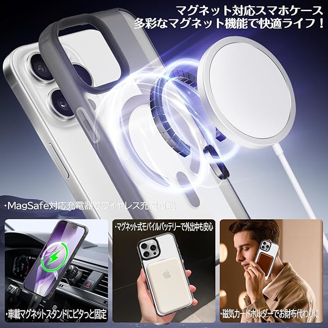 ★【MagSafe対応・強力な吸着充電】内蔵された強力なマグネットでピッタリと密着し、MagSafeに対応した全ての機能と完全に互換性があります。iPhone 15 Proの充電効率が大幅に向上しました。 アイフォン 15 Pro ケース を外すことなく、MagSafe充電器、MagSafeバッテリー、MagSafe車載ホルダー、MagSafeリングなど、全てのMagSafeアクセサリーを使用できます。スマホを充電する時は、アイフォン 15 Proケースを装着したままMagSafe充電器に取り付けるか、Qi規格の充電器の上に置くだけです。充電できていなかったということを避けられるのが魅力です。より簡単で、より高速で、日常生活に便利な iPhone 15 Pro ケース です。