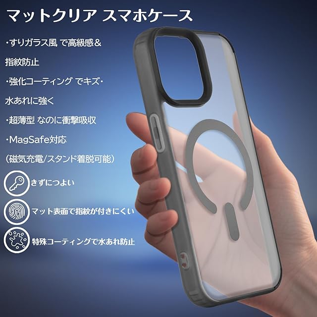 【商品説明】:<br>★【対応機種】:iPhone 15 Pro Max 専用設計のスマートフォンケース。すべてのインターフェイスを正確にカットし、操作性と機能性を高め、スマートフォンとしての使い勝手を向上させると同時に、老若男女問わず、おしゃれで美しい外観を実現しています。<br> <br>★【半透明美学・さようなら黄ばみ】背面の特性を活かした半透明デザインで、iPhone 15 Pro Maxのかっこいいリンゴロゴが薄っり見え、高級感と神秘感を漂わせています。耐久性や耐摩耗性に優れたポリカーボネートの背面は、長く使っても綺麗な印象で、絹のようなマットな質感で、サラサラして触り心地が良いです。誰にでも似合う落ち着いた質感で、惚れ惚れ眺め・触りたい感じです。背面が艶消しマット質感でまるでベルベットのように優しく心地よいを楽しめ、優しい手触り触るだけで心が癒される。さらに、マット質感×ベルベット触感のハイブリッド設計で、指紋付着率を従来比75%低減。半透明+黒の二色構造で黄ばみの心配が一切なく、黄ばみに悩んでいる方に大正解!までにない耐久性を誇り、何年使っても十分です!<br><br>★【MagSafe対応・強力な吸着充電】内蔵された強力なマグネットでピッタリと密着し、MagSafeに対応した全ての機能と完全に互換性があります。iPhone 15 Pro Maxの充電効率が大幅に向上しました。 アイフォン 15 Pro Max ケース を外すことなく、MagSafe充電器、MagSafeバッテリー、MagSafe車載ホルダー、MagSafeリングなど、全てのMagSafeアクセサリーを使用できます。スマホを充電する時は、アイフォン 15 Pro Maxケースを装着したままMagSafe充電器に取り付けるか、Qi規格の充電器の上に置くだけです。充電できていなかったということを避けられるのが魅力です。より簡単で、より高速で、日常生活に便利な iPhone 15 Pro Max ケース です。<br><br>★【カメラまで高保護・細部まで豊かに】精密機械測定で厳密に寸法を測定し、誤差ゼロの1:1装着感を実現。ケースの縁を「カメラレンズより1.5mm高、スマホ画面より1mm高」に隆起させ、全方位からiPhone 15 Pro Max向けレンズ保護を提供。写真を撮るたびにスマホをしっかりガードし、破損リスクを軽減。高額な修理費用も節約できる。<br><br>★【落下の不安をゼロに】頑丈なPC背面と柔軟なTPUフレームを採用し、四隅にエアクッションを配置したデザインで、防塵、防傷、滑り止め衝撃吸収に優れ、日常使用に対する確かな保護を提供する 。品質付き万が一問題が発生した場合は、注文ページからお問い合わせいただければ、90日以内に品質を受けられます。<br>