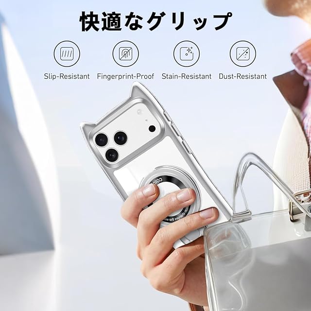 商品名:iPhone 17 Pro ケース 猫耳 クリア 薄型 いphone 17 pro カバー 軽量 MagSafe対応 ワイアレス充電 TPU 韓国 ねこ アイフォン17 pro 携帯ケース リング付き 磁力強 多機能 スタンド 転倒防止 かんしょうほご 耐久性 黄変防止 ひっかき防止 やわらかい ポータブル めっき加工技術 (シルバー)