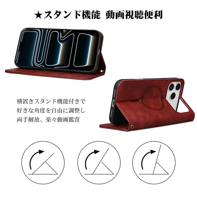 スタンド機能:スタンド機能付きのiPhone 17 Pro Max 手帳型カバーで、横置きにして角度調整が可能です。動画視聴やビデオ通話、オンライン会議などに快適にお使いいただけます。