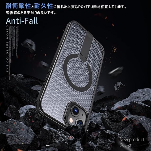 【上質なPC+TPU素材】、【放熱性高い+超強耐衝撃性】、【スタンド付き+強力な磁力吸着+ストラップホール】、【滑り防止・握り心地抜群】