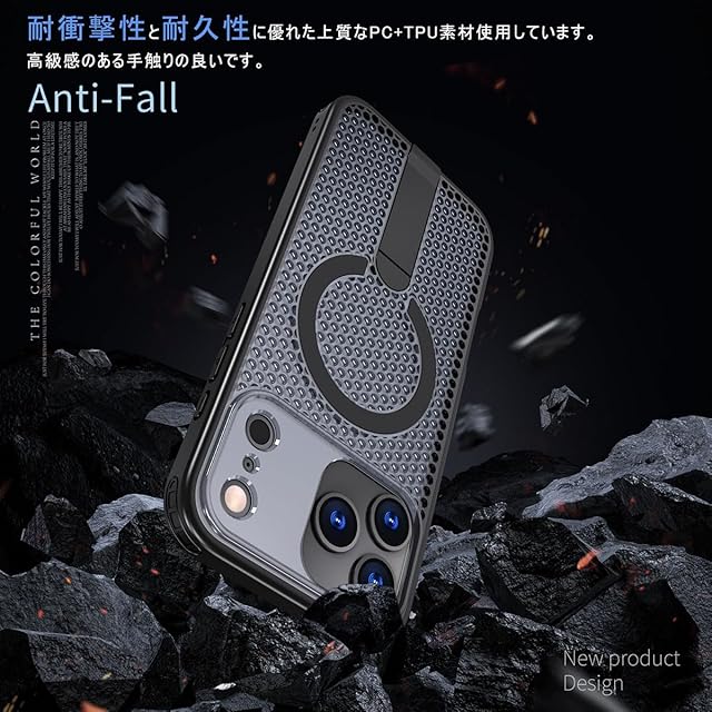 【上質なPC+TPU素材】、【放熱性高い+超強耐衝撃性】、【スタンド付き+強力な磁力吸着+ストラップホール】、【滑り防止・握り心地抜群】