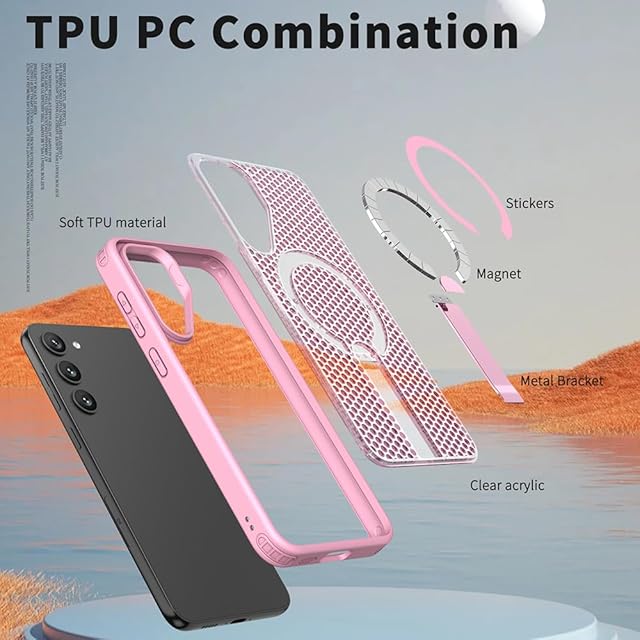 YUZOR for Galaxy S24 ケース SC-51E | SCG25 冷却 放熱 メッシュ スマホケース Qi充電 スタンド付き Samsung S24 カバー 滑り止め 指紋防止 耐衝撃 米軍MIL規格取得 ストラップホール付き (GalaxyS24 ピンク) FX-S24-fen