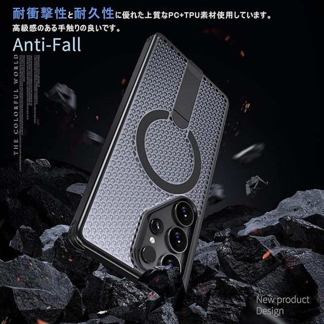 【上質なPC+TPU素材】、【放熱性高い+超強耐衝撃性】、【スタンド付き+強力な磁力吸着+ストラップホール】、【滑り防止・握り心地抜群】