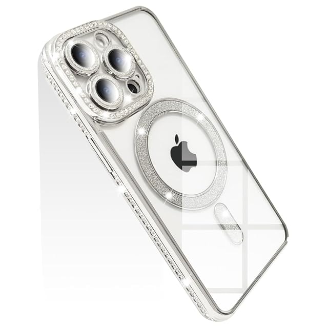 JOOBOY スマホケース 対応 iPhone 13 Pro Max クリア ケース 透明 メッキ加工 Magsafe対応 きらきら ブリンブリン 衝撃吸収 かわいい キラキラ 女性 人気 キャラクター ワイヤレス充電対応 おしゃれ ストラップホール付き アイフォン13プロマックス 携帯カバー (シルバー, iPhone13 Pro Max)