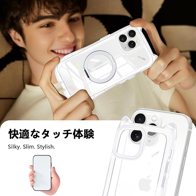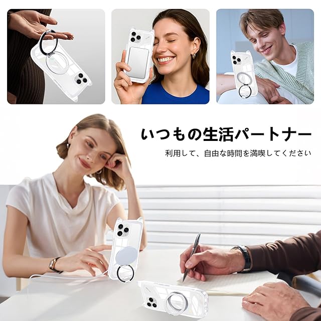 商品名:iPhone 11 Pro ケース クリア リング付き 隠しスタンド 猫耳 ネコミミ アイフォン11 Pro ケース MagSafe対応 360度回転スタンド リング付き iphone 11 pro スマホケース TPU 縦横両対応 多機能 マグネット搭載 車載対応 可愛い 猫柄 カバー 韓国 おしゃれ アニメ 耐衝撃 黄変なし 米軍MIL規格 落下防止 全面保護(ホワイト)