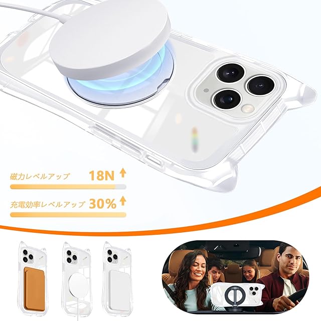 「Magsafe対応」ケースをつけたままマグセーフ機能を快適に使用できます。背面に薄くて強いマグネット内蔵しています、ワイヤレス充電や車載ホルダーやアクセサリとのあらゆる充電に安定で接着ができ、差し込みのいらないより簡単により素早く充電できます。