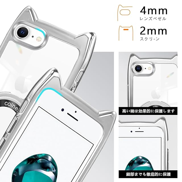商品名:iPhone SE3 / iPhone 7 / iPhone 8 ケース クリア リング付き 猫耳 ネコミミ MagSafe対応 ワイヤレス充電 アイフォンse3 / 7 / 8 スマホケース 透明 TPU 多機能 マグネット搭載 縦横両対応 車載対応 ネック ショルダー 肩掛け 首掛け 斜めがけ 紐付き 長さ調整可能 韓国 かわいいファッション 耐衝撃 薄型 軽量 落下防止(シルバー)