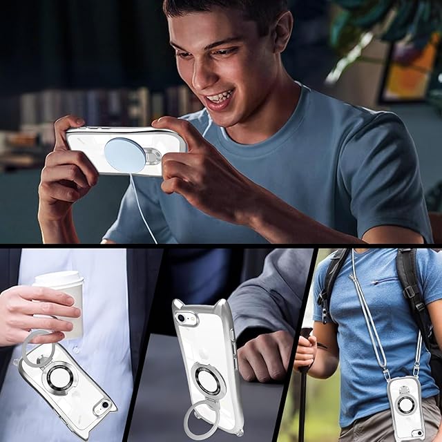 iPhone SE3 / iPhone 7 / iPhone 8 ケース クリア リング付き 猫耳 ネコミミ MagSafe対応 ワイヤレス充電 アイフォンse3 / 7 / 8 スマホケース 透明 TPU 多機能 マグネット搭載 縦横両対応 車載対応 ネック ショルダー 肩掛け 首掛け 斜めがけ 紐付き 長さ調整可能 韓国 かわいいファッション 耐衝撃 薄型 軽量 落下防止(シルバー)