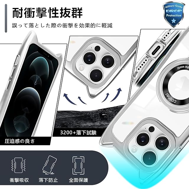 商品名:iPhone12 Pro Max/iPhone13 Pro Max ケース クリア リング付き 猫耳 ネコミミ TPU MagSafe対応 ワイヤレス充電 iphone 12 pro max カバー 透明 アイフォン13 pro max ケース ネック ショルダー 肩掛け 首掛け 斜めがけ 紐付き 長さ調整可能 韓国 耐衝撃 多機能 マグネット搭載 縦横両対応 車載対応 落下防止(シルバー)