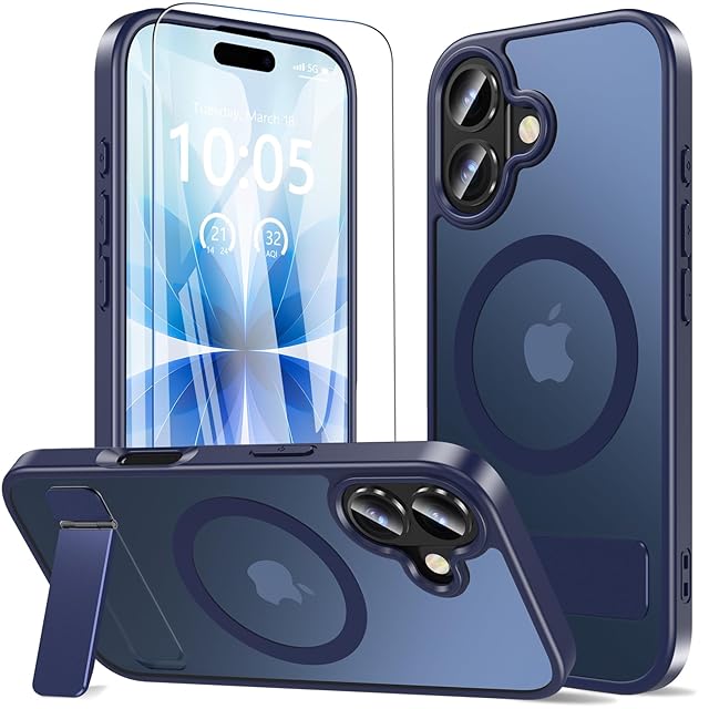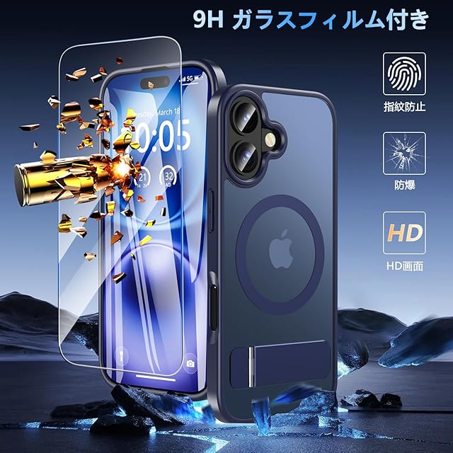 Fin2feel iPhone 17 ケース【MagSafe高速充電対応】ガラスフィルム &スタンド付き 米軍 MIL 耐衝撃認定 耐衝撃・指紋防止・黄ばみ防止 TPU+PC 素材 6.3 インチ専用(ブルー)
