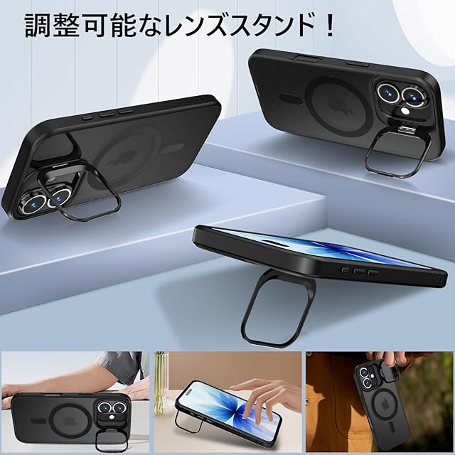 iphone 17用ケース レンズスタンド付き iphone 17 ケース Magsafe対応 隠れスタンド アイフォン 17 カバー 米軍MIL規格 耐衝撃 スマホケース アイフォン 17 軽量 いphone17 カバー マグネット内蔵 防指紋 半透明 マット 黄変防止 6.3インチ ブラック【SHANGHAO】