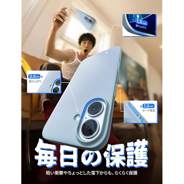 【日常の衝撃から・しっかりと守る】耐久性抜群のBayer製PC複合素材を厳選し、高い「剛」としなやかな「柔」を両立。日常の擦れや落下衝撃から大切なiPhone17を守ります。特に入念に設計されたのは、画面とカメラを守る“縁の高さ”。レンズ周りは2.5mm、画面まわりは1.5mm高く立ち上げ、衝撃や擦れから保護します。平らな面に置いても擦れや傷の心配なし。さらに、ボタン周りも1.2mmを高めた構造で保護され、強化された角が衝撃からしっかり守ります。しなやかながらも強靭な素材こそ、「柔よく剛を制する」保護性能が実現できます。