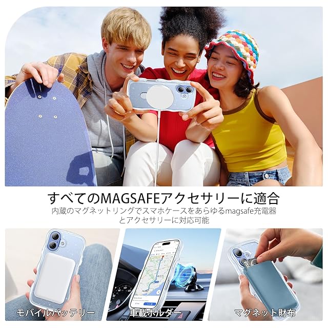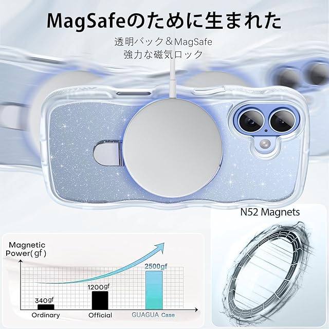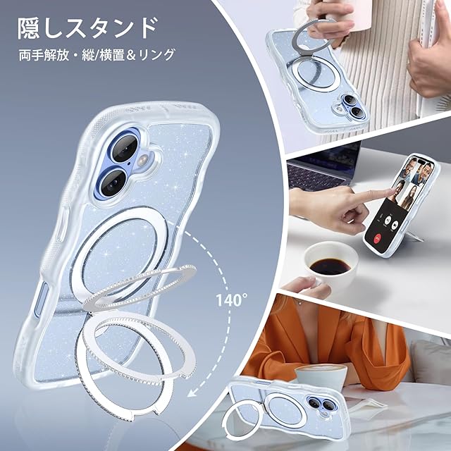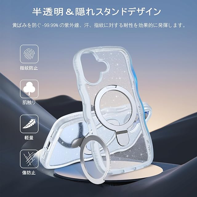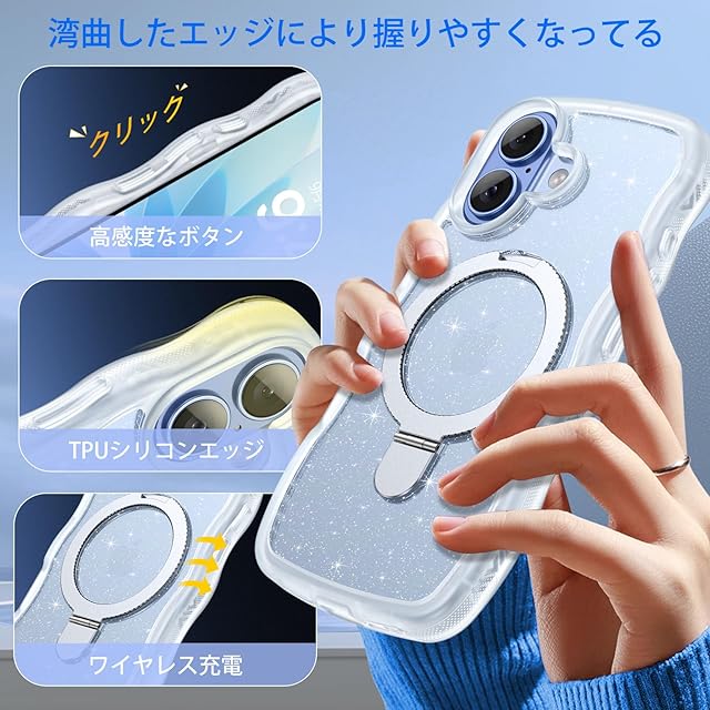 商品名:GUAGUA iphone 17 ケース ウェーブ きらきら Magsafe対応 回転スタンド ワイヤレス充電 あいふおん17 クリアケースうねうね かわいい 透明 人気 韓国 耐衝撃 超軽量 黄ばみなし アイフォン 17米軍規格 耐衝撃 マグセーフ 金属キックスタンド マグネット搭載 あいほん 17 なみなみ カバー(白い)