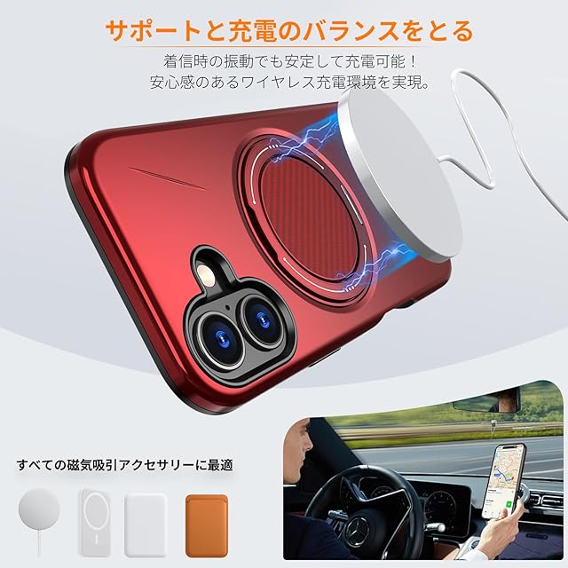 商品名:TLOMPLO for iPhone 17 用ケース magsafe対応 360°回転スタンド 耐衝撃 米軍MIL規格 強磁力 リング付き ワイヤレス充電対応 アイフォン 17 用カバー 指紋防止 レンズ保護 赤 525-ip17-02