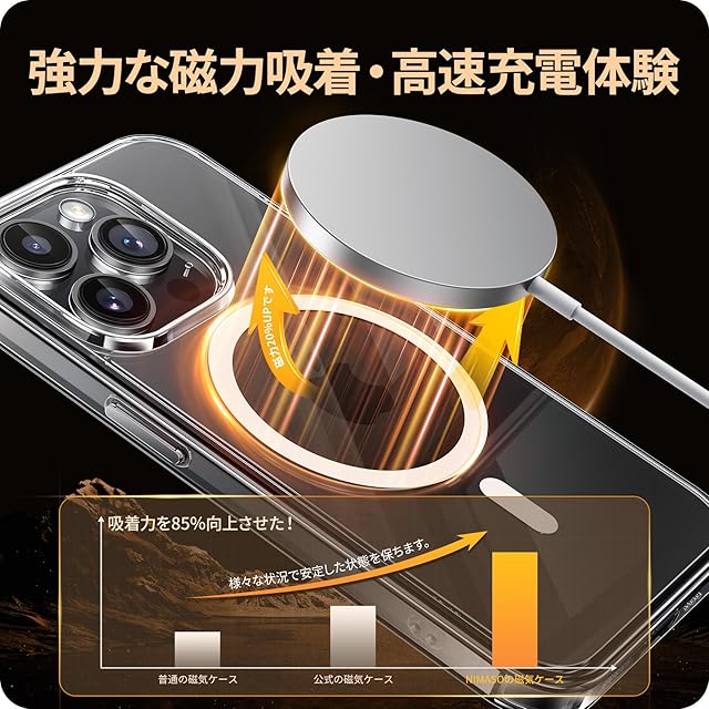 【MagSafe対応・強力な磁力吸着】スマホケース内部に38個の強力なN52マグネットを搭載しており、一瞬でピッタリと高速充電を実現!いくら振っても落ちないので、充電しながらゲームをやっても問題なし!また、ワイヤレス充電やモバイルバッテリー・車載ホルダー・スタンド・リングなど全てのMagSafeアクセサリーにもばっちり対応しています。