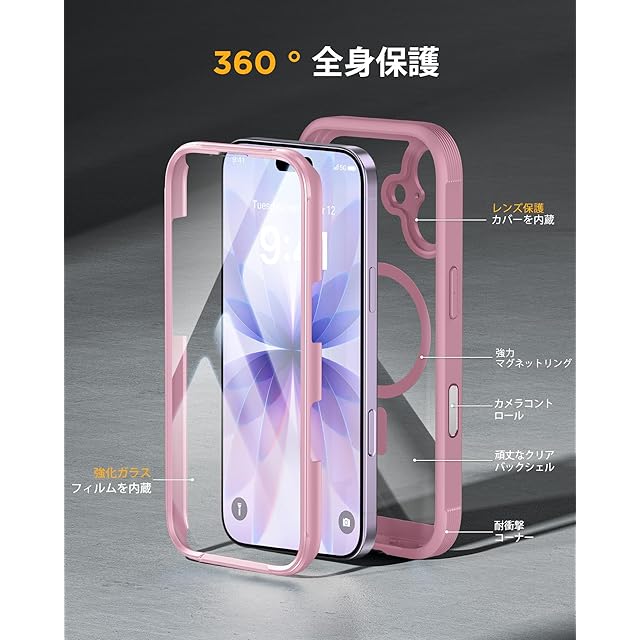 商品名:Miracase iPhone17 ケース MagSafe対応 スマホケース いPhone17 用 カバー 9H 強化ガラス 360°保護 全身バンパー保護ケース 6.3インチ フルカバー ワイヤレス充電対応 マグセーフ対応 マグネット搭載 ダークピンク