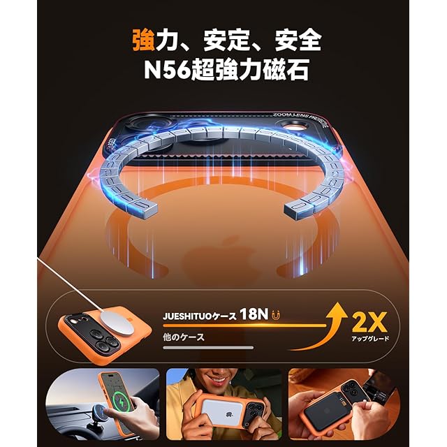 【超強力マグネット】JUESHITUO iPhone 17 pro max ケース magsafeは先進のハルバッハ磁気リング技術を採用し、48個のN56強力磁石を内蔵。磁力は公式の2倍に達し、全ての磁気アクセサリーと確実に接続可能。より速い充電速度、より強力な吸着力、安定したグリップ感を実現。路面が揺れても岩のように揺るぎない安定性を保ちます。