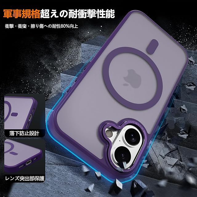 商品名:PinLiSheng iPhone 17 MagSafe対応 ケース マット 半透明 金属ボタン 耐衝撃 肌に優しい触感 指紋防止 米軍MIL規格 黄変防止 ストラップホール付き スマホケース パープル