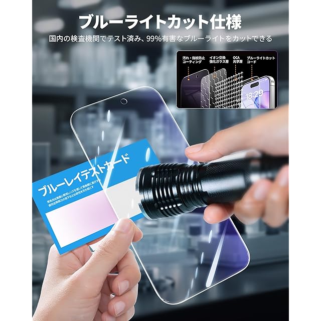 「ブルーライトカット機能・目の疲れ軽減」:米軍「MIL-STD-810H」規格SGS認証(認証番号:GZMR220702278001-1)のブルーライト反射技術によりブルーライトを大幅にカットしています。ブルーライトをカットすることで、目の疲労を緩和します。長時間アイフォン 17 プロの画面を見たり、ゲームをしたりする方におススメです。(ご注意:ブルーライトカット加工のため、スマホの角度や背景の色によって、薄く紫がかって見えたり、黄色っぽく見えることがございます)
