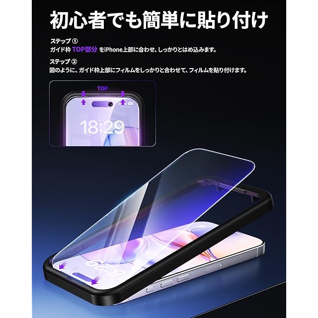 「たったの3ステップ・簡単に貼り付け」ガイド枠をはめる→上側に合わせて、フィルムを置く→軽く押すだけで自然に吸着。初めての方でも簡単に貼り付けられるよう、専用の貼り付けガイド枠を同梱しています。アイフォン17プロと保護フイルムがズレることなく、誰でも簡単に貼ることができます。