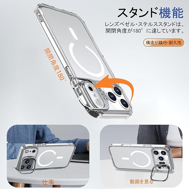 【高品質素材·ワイヤレス充電対応】高品質PC+TPU素材を採用し、外部からの衝撃をしっかりと吸収します。柔軟性のため、着脱も容易にできます。スマートフォンを日常生活で傷から守る。一体型のデザインで、いつでもスタンドを使うことができ、利便性が大幅に向上!ケーススタンド内部に360度全周一体の高性能磁石を埋め込み、ワイヤレス充電に対応しています。