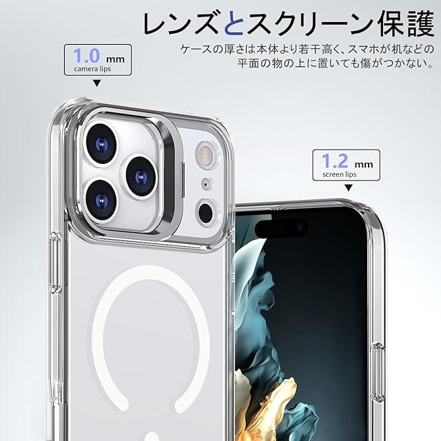 【レンズとスクリーン保護】ケースの厚さは本体より若干高く、スマホが机などの平面の物の上に置いても傷がつかない。iphone 17が落下した際に液晶画面やレンズに傷が付かないようにする。