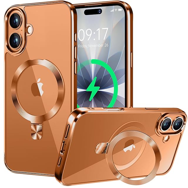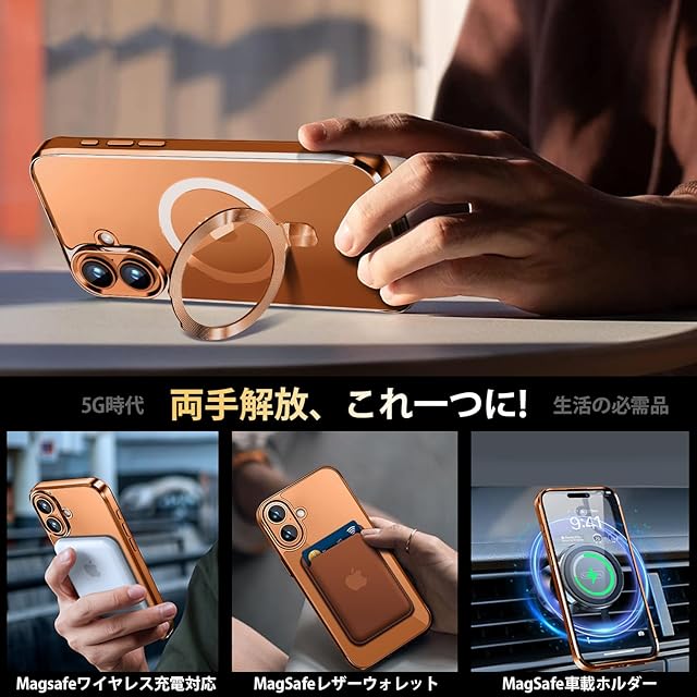 商品名:【CD MagSafeリング・スタンド一体】iPhone 17 用クリアケース[MagSafe対応・隠しスタンド] [本体の色・メッキバンパー]ストラップホール付き 角度調整可 米軍MIL規格取得・耐衝撃 アイホン17透明ケース スマホケース17 人気 6.3インチ(オレンジ)