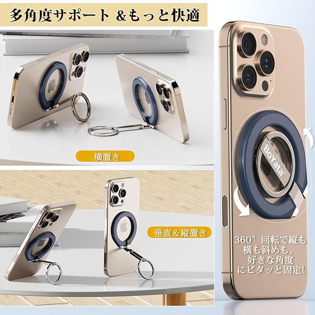 商品名:(最新改良)BoYata スマホリング 両面マグネット 超强磁力 マグセーフ リング マグネット式 携帯リング バンカーリング メタルリング付き スタンド機能 落下防止 角度調整可 簡単着脱 超軽量薄型 高級合金素材 iPhone17 16 15 14 13 12 Xperia Android全機種対応 ネイビーブルー