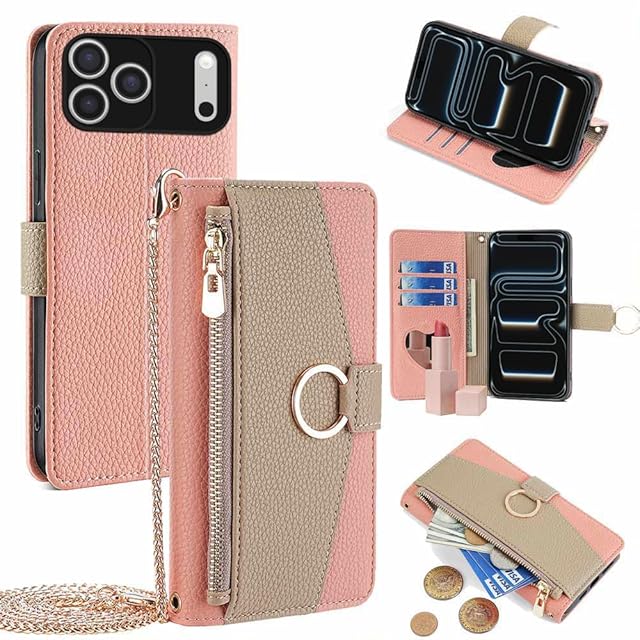 TOO&SOO 対応 iPhone 17 Pro ケース 鏡付き いphone17pro ケース ショルダー ストラップ付き アイフォン17プロ 携帯ケース スタンド機能 アイホン17 プロ カバー カード収納 ミラー付き 耐衝撃 肩掛け あいふぉん17プロ スマホケース おしゃれ 女性 柔らかいTPU iPhone 17 Pro ケース 手帳型 斜め掛け - ピンク