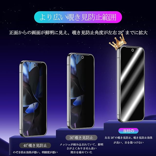 <b>なぜ Tzcizの Google Pixel10 Pro 覗き見防止 フィルム を選んだのか?</b><br><br><b>一、上質な製品</b><br><br>【覗き見防止】画面を左右から覗かれることを防ぐ180°のプライバシー保護フィルムです。スマホの正面にいるユーザーだけ画面内容をクリアに見えます。<br><br>【表面強度:9H】<br>日本旭硝子素材を採用、表面強度指数は9Hで、一般的なフィルムの3倍で、で鋭利な物による傷を完璧にブロック。<br><br>【飛散防止】<br>飛散防止加工により、万が一、割れてしまった場合にもほとんどガラス破片が飛び散りづらくて、安心です。<br><br>【ラウンドエッジ加工】<br>ラウンドエッジ加工、手にフィットしやすくて、それに端の部分も浮かべにくいです。<br><br>【気泡防止】<br> フイルム接着面に吸着に優れたシリコンコーティングを施しているので、位置を合わせて上から軽く置くだけで気泡が入ることなく。<br><br>【指紋防止】<br>指紋防止コーティング加工、普通のガラスより指紋が残りにくく。疎水性と抗油性を兼ねていて、水と油脂を画面から簡単に取り除きます。<br><br>【高透過率】<br>透明度が93%以上と高く、フィルムを貼っていても画面の精細さを損ないません、スクリンの鮮明な色を復元します。<br><br>【高感度タッチ感】<br>3Dタッチ対応ためます。高感度のフィードバックで遅延なく、本来のタッチ感で、快適な操作感を実現します。<br><br>【パッケージ内容】<br>Google Pixel 10 Pro ガラスフィルム【2枚】<br>クリーニングキット【2枚】<br>ホコリ除去用ステッカー【2枚】<br>取扱説明書【1枚】<br><br><br><b>二、良好なアフターサービス </b><br><br>製品には万全を期しておりますが、万が一輸送の過程による落下や衝撃を受けて不具合か初期不良でしたら、遠慮なく連絡してください。 私達は一日中オンラインサービスで皆様に最高のサービスを提供します!<br><br><b>三、貼り付け方法</b><br><br>1.アルコールパッドを使って液晶画面の汚れを拭き取リます。<br>2.ホコリ取りシートを使って、液晶画面に残ったホコリや布繊維を取り除きます。<br>3、フィルムの接着面の保護フィルムを剥がします。コーナーの位置を合わせ、画面上に載せます。コーナー四点を取り付けます、この時点で位置がズレていたら修正します。<br>4、位置が決まったら、液晶画面にそっと置くように手を離す指で押すと一発で綺麗に貼れますが、気泡あるいは浮きが少し出た場合は、クロスを使って気泡を中央から外側に押し出して下さい。<br>注意:貼り直す時、一部のフィルムを剥がすのではなく(フィルムの素材はガラスなので、剥離と貼り付けの力が不均衡、ひび割れや気泡混入、端が浮いてるなどのことが出る可能性があります。)、フィルム全体を剥がすのはポイントです。貼り直しによる浮きを避ける為、剥がす時にフィルムの接着面に触らないように慎重に剝がしてくださいませ。
