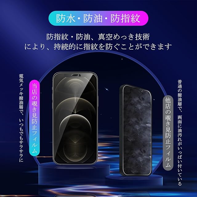 <b>なぜ Tzcizの iPhone12 Pro 覗き見防止フィルム + カメラフィルム + ガイド枠 を選んだのか?</b><br><br><b>一、上質な製品</b><br><br>【覗き見防止】画面を左右から覗かれることを防ぐ180°のプライバシー保護フィルムです。スマホの正面にいるユーザーだけ画面内容をクリアに見えます。<br><br>【表面強度:9H】<br>日本旭硝子素材を採用、表面強度指数は9Hで、一般的なフィルムの3倍で、で鋭利な物による傷を完璧にブロック。<br><br>【飛散防止】<br>飛散防止加工により、万が一、割れてしまった場合にもほとんどガラス破片が飛び散りづらくて、安心です。<br><br>【ラウンドエッジ加工】<br>ラウンドエッジ加工、手にフィットしやすくて、それに端の部分も浮かべにくいです。<br><br>【気泡防止】<br> フイルム接着面に吸着に優れたシリコンコーティングを施しているので、位置を合わせて上から軽く置くだけで気泡が入ることなく。<br><br>【指紋防止】<br>指紋防止コーティング加工、普通のガラスより指紋が残りにくく。疎水性と抗油性を兼ねていて、水と油脂を画面から簡単に取り除きます。<br><br>【高透過率】<br>透明度が93%以上と高く、フィルムを貼っていても画面の精細さを損ないません、スクリンの鮮明な色を復元します。<br><br>【高感度タッチ感】<br>3Dタッチ対応ためます。高感度のフィードバックで遅延なく、本来のタッチ感で、快適な操作感を実現します。<br><br>【パッケージ内容】<br>iPhone12 Pro ガラスフィルム【2枚】<br>iPhone12 Pro レンズフィルム【2枚】<br>ガイド枠【1枚】<br>スクリーンクリーニングキット【2枚】<br>ホコリ除去用ステッカー【2枚】<br>取扱説明書【1枚】<br><br><br><b>二、良好なアフターサービス </b><br><br>製品には万全を期しておりますが、万が一輸送の過程による落下や衝撃を受けて不具合か初期不良でしたら、遠慮なく連絡してください。 私達は一日中オンラインサービスで皆様に最高のサービスを提供します!<br><br><b>三、貼り付け方法</b><br><br>1.クリーニングキットを使って液晶画面の汚れを拭き取リます。<br>2.ホコリ取りシートを使って、液晶画面に残ったホコリや布繊維を取り除きます。<br>3、フィルムの接着面の保護フィルムを剥がします。コーナーの位置を合わせ、画面上に載せます。コーナー四点を取り付けます、この時点で位置がズレていたら修正します。<br>4、位置が決まったら、液晶画面にそっと置くように手を離す指で押すと一発で綺麗に貼れますが、気泡あるいは浮きが少し出た場合は、クロスを使って気泡を中央から外側に押し出して下さい。<br>注意:貼り直す時、一部のフィルムを剥がすのではなく(フィルムの素材はガラスなので、剥離と貼り付けの力が不均衡、ひび割れや気泡混入、端が浮いてるなどのことが出る可能性があります。)、フィルム全体を剥がすのはポイントです。貼り直しによる浮きを避ける為、剥がす時にフィルムの接着面に触らないように慎重に剝がしてくださいませ。
