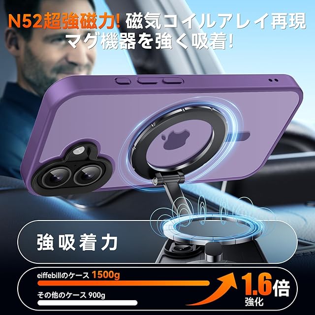 【超強力マグネット搭載・超強吸着力】Eiffebill スマホケース iphone 16 plus適合 の内部には、38個のN52マグネットを採用。従来比150%向上した磁力で、充電器やMagSafe対応アクセサリーにピタッと確実に吸着。激しく振っても外れないため、スタンドやカーチャージ時も安定したハンズフリー体験を実現。