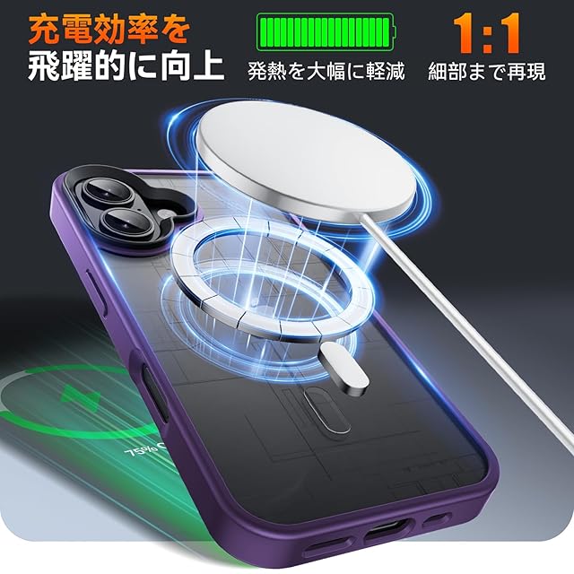 商品名:Eiffebill iPhone 16 Plus 用 ケース MagSafe対応 【米軍規格・全面保護・耐衝撃】マグネット搭載、ワイアレス充電対応 半透明マット仕上げの背面、滑り止め ストラップホール付き スマホケース iphone 16 Plus 6.7インチ用 (パープル)