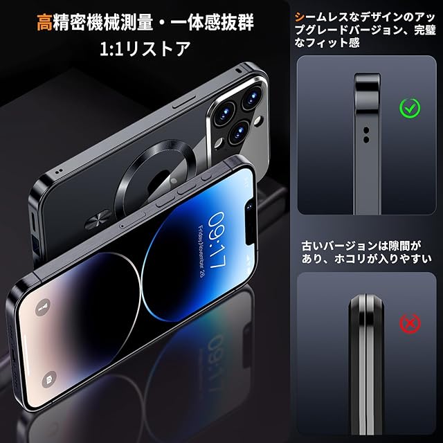 商品名:Rosycover【新次元の一体型レンズ・メカニカルロック】iPhone 13 Pro 用の ケース Mag-safe対応[360°全面保護・両面強化ガラス][本体の色・CD Mag-safeリング]マグセーフ ワイヤレス充電対応 ストラップホール付き アルミ合金バンパース アイホン13プロ 金属 ケースマホケース13 Pro クリア 人気 6.1インチ(ブラック)