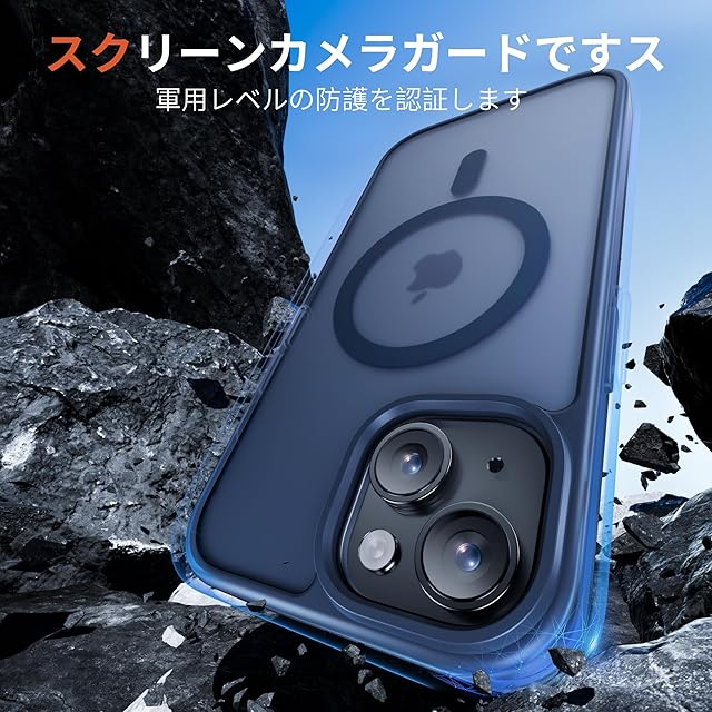 商品名:Bruzaio iPhone 15 用 ケース【強化フィルム2枚付き】Magsafe対応・米軍規格 いphone15 ケース 半透明 耐衝撃 指紋防止 滑り止め マグネット搭載 ワイヤレス充電 耐久性 全面保護 黄ばみなし あいほん15スマホケース 6.1インチ用,ネイビー