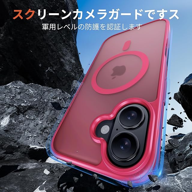 【落下の不安をゼロに!・MIL 規格対応】頑丈なPC背面と柔軟なTPUフレームを採用し、四隅にエアクッションを配置したデザインで、防塵、防傷、滑り止め衝撃吸収に優れ、日常使用に対する確かな保護を提供する iPhone 16 スマホケース です。また、液晶画面より1.2 mm、カメラレンズより1.5 mm高い高低差設計を採用し、カメラ周囲を完全に覆うレンズ保護設計で、スマートフォン本体を徹底的に守ります。平面に置いてもうっかり落としてもスマートフォンを保護できる iPhone 16 カバー です。