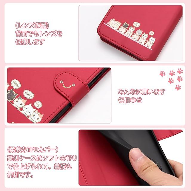 商品名:Qribo Arrows We2 Plus F-51E ケース 手帳型 Arrows We2 Plus ケース アローズ F-51E ケース シンプルなのに可愛いデザイン エンボス加工猫柄 うれしい気持ち 6.6インチ対応 Arrows F-51E ケース アロウズwe2 Plus カバー Arrows F51E スマホケース 薄型 防水 の耐久性 滑り防止 美しい 贈り物 友達 - レッド