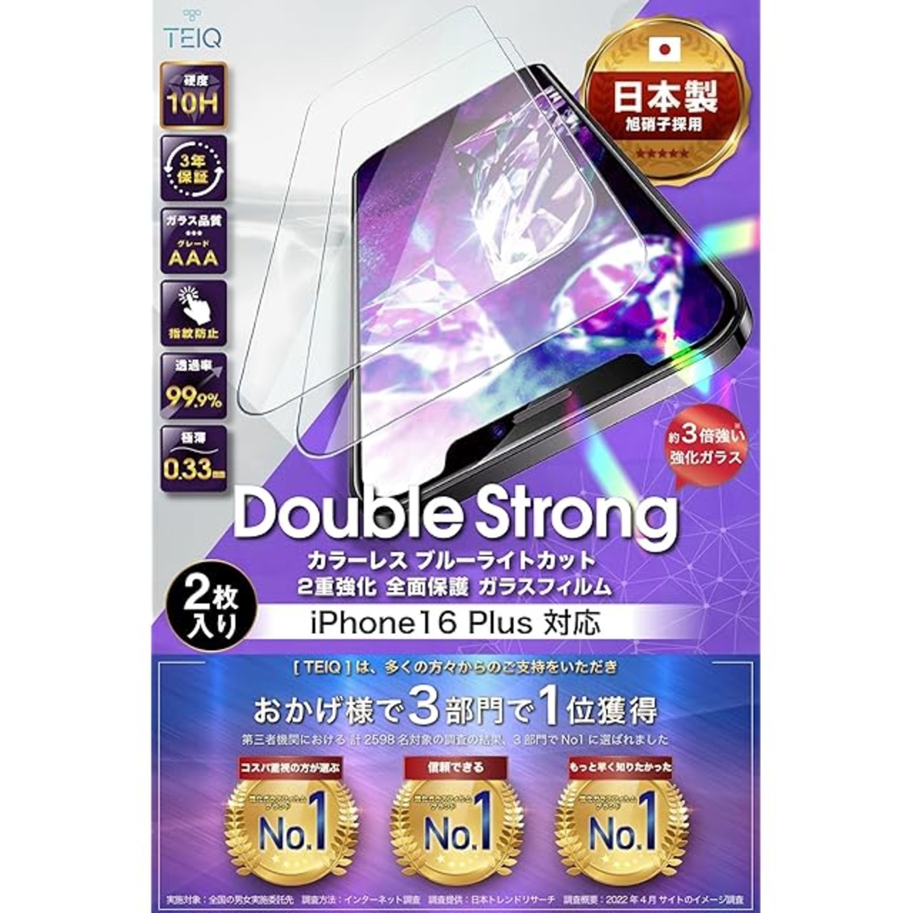 TEIQ iPhone16Plus ガラスフィルム ブルーライトカット 透明 【3倍強い 硬度10H 二重強化ガラス】 日本製旭硝子 全面保護 フィルム ガイド枠付き 2枚セット iPhone 16 Plus プラス 対応 GFDS-BLC-22