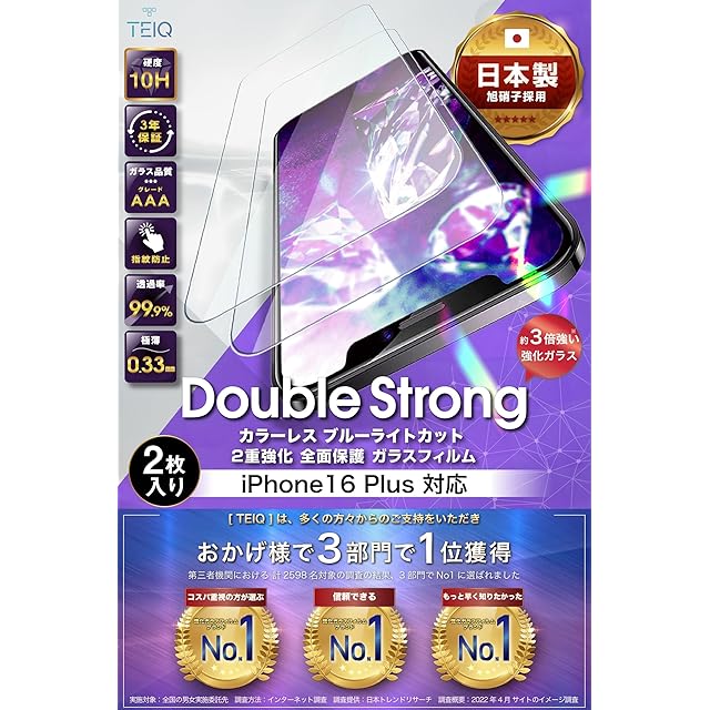 商品名:TEIQ iPhone16Plus ガラスフィルム ブルーライトカット 透明 【3倍強い 硬度10H 二重強化ガラス】 日本製旭硝子 全面保護 フィルム ガイド枠付き 2枚セット iPhone 16 Plus プラス 対応 GFDS-BLC-22