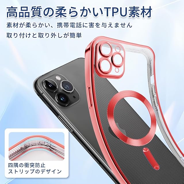 商品名:iPhone 11 Pro Max ケース MagSafe対応 クリア メッキ加工 アイフォン11ProMax スマホケース 耐衝撃 TPU ワイヤレス充電対応 いpほね 11 pro max カバー ストラップホール付き 薄型 透明 超軽量 黄ばみにくい 柔軟 滑り止め (レッド)