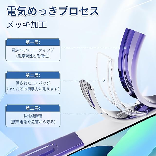 【電気めっきプロセス設計】TPUと超高密度メッキ技術を採用し、バンパーコーティングは高度なスプレーメッキ技術を採用し。3層スプレーメッキ技術と超微細なレーザー加工技術、カラーコーティングの色を長持ちさせ、明るくします。メッキコーティングは傷がつきにくく。背面は透明度の高TPU素材を使用、本体の色をそのまま映し出すことができ端末のオリジナルカラーを損ねません。透明な背面は携帯電話の本来の美しさを示し、フレームのメッキ加工テクノロジーはよりおしゃれに感じます。