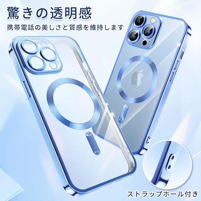 商品名:iPhone 13 Pro Max ケース MagSafe対応 クリア メッキ加工 アイフォン13ProMax スマホケース 耐衝撃 TPU ワイヤレス充電対応 いpほね 13 pro max カバー ストラップホール付き 薄型 透明 超軽量 黄ばみにくい 柔軟 滑り止め (ブルー)