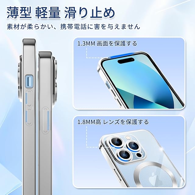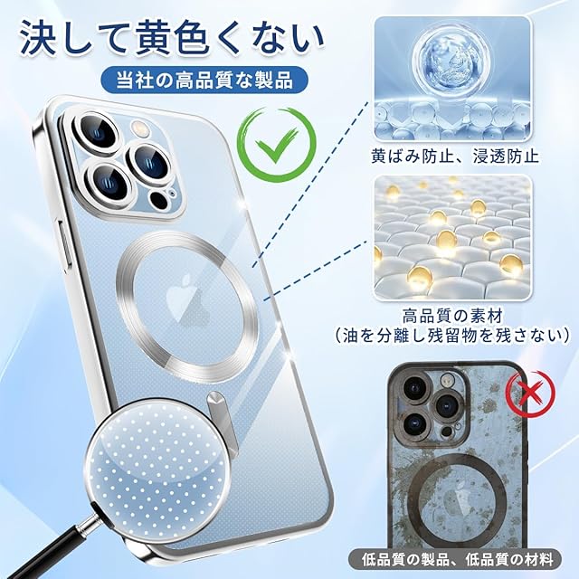 商品名:iPhone 14 Pro Max ケース MagSafe対応 クリア メッキ加工 アイフォン14ProMax スマホケース 耐衝撃 TPU ワイヤレス充電対応 いpほね 14 pro max カバー ストラップホール付き 薄型 透明 超軽量 黄ばみにくい 柔軟 滑り止め (シルバー)