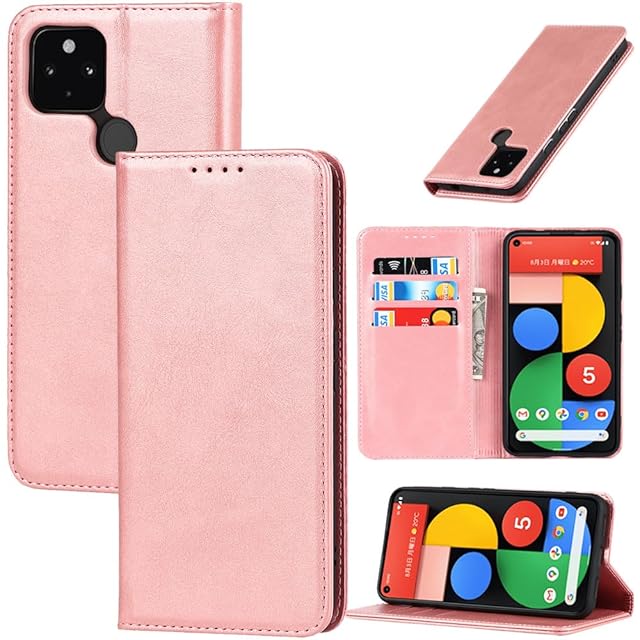 対応 Google pixel5 ケース 手帳型 スマホケース グーグル ピクセル5 カバー 手帳型 カードスロット、キックスタンド レザー(ローズゴールド)