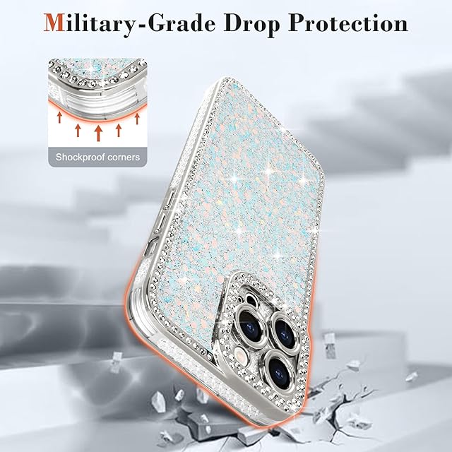【キラキラと輝くデザイン】: この美しいスマホケースは、ボーダーとカメラレンズリム部分に施されたダイヤモンドで豪華な印象をかもし出します。背面には微細なグリッターを樹脂層で封入する独自加工を採用しています。粉落ちや変色の心配がなく、長期間にわたり強い輝きを維持します。光の角度によって変化する繊細なきらめきが、あなたの携帯電話を高級アクセサリーへと変えます。